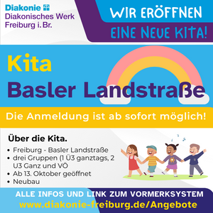 Die neue Kita Basler-Landstraße in Freiburg St. Georgen ist eine von zwölf Kindertagesstätten des Diakonischen Werks Freiburg. Die Kita eröffnet für Kinder und Familien zum 13.10.25 und bietet 55 Kindern zwischen einem Jahr bis zum Schuleintritt in drei Gruppen von 7.30 Uhr bis 14.30 Uhr bzw. bis 16.30 Uhr Platz.